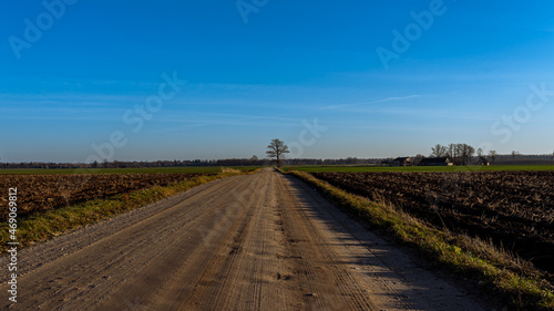 © Ieva, Naklejka premium A dirt road with holes. A tree without leaves at the side of the road.