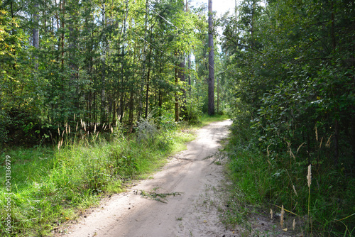 © Irina, Naklejka premium a dirt road with the sunlight at the end is surrounded by tall pine trees