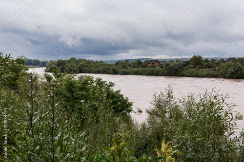 © Maryana, Obraz premium A dirty river flooded the surrounding vegetation. Top view of the river that overflowed against the background of a stormy sky