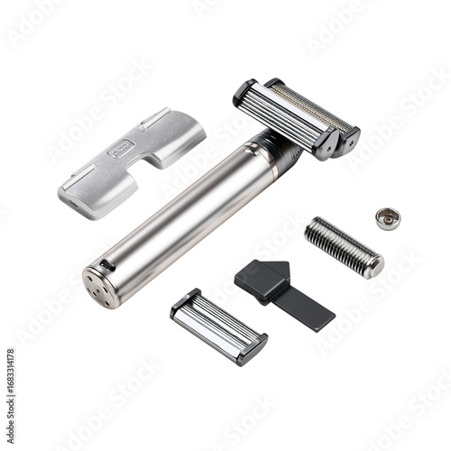© Alina Art Works, Naklejka premium A disassembled safety razor with various components scattered on a black background close up view