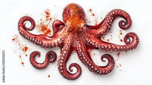 © Pannin, Fototapeta premium A dish of freshly grilled octopus (pulpo a la gallega) sprinkled with paprika on a white background