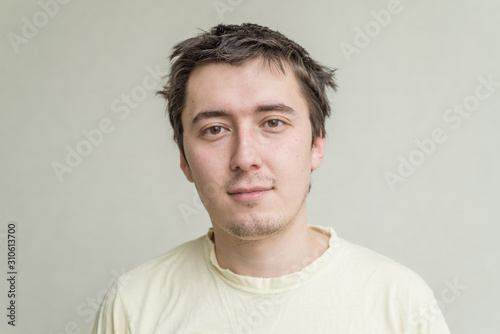 © Асель Иржанова, Fototapeta premium a disheveled man. unkempt crazy man in a torn t-shirt on a gray background