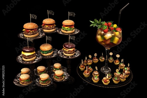 Naklejka premium A display of gourmet burgers and colorful fruit cocktails on elegant serving...