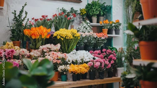 © Agri, Fototapeta premium A display of various colorful flower arrangements and potted plants