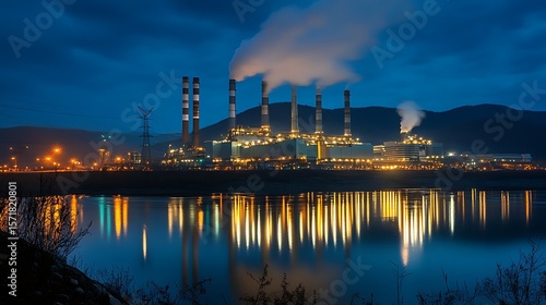 © Being Artistic, Naklejka premium A Distant Panoramic Image of a Thermal Power Plant with Airborne Emissions Representing Human Impact on Climate and Atmospheric Pollution