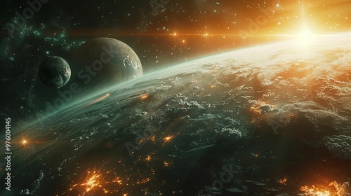 © budi, Fototapeta premium A Distant Planet with a Bright Star and a Smaller Moon in Space