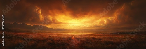 © peerawat, Obraz premium A distant thunderstorm over a prairie, captured at sunset