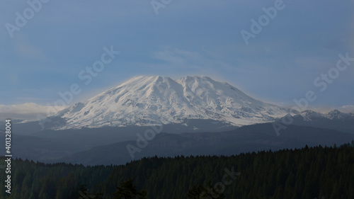 Fototapeta premium A distant view from the valley toward a snow covered Mt. St. Helens, Skamania...
