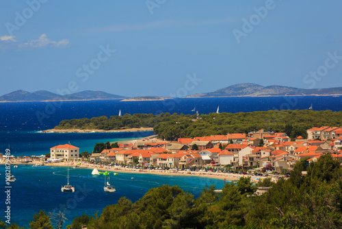 Fototapeta premium A distant view of the charming city of Primosten, Croatia, with clear blue...