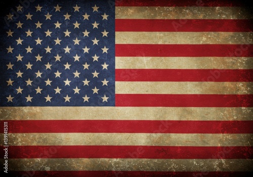 © Aklima, Naklejka premium A distressed american flag with red and white stripes and blue field with white stars design