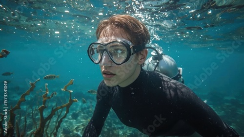© Soleh, Fototapeta premium A diver explores the ocean depths, observing the marine environment.