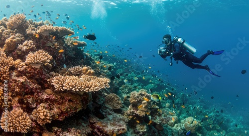 © Laviender, Obraz premium a diver found a giant beautiful corals with a lot of tiny fish