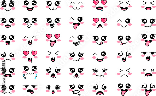 © Arlessa, Naklejka premium A diverse collection of cute cartoon facial expressions featuring various emotions, with blushing cheeks and expressive eyes.