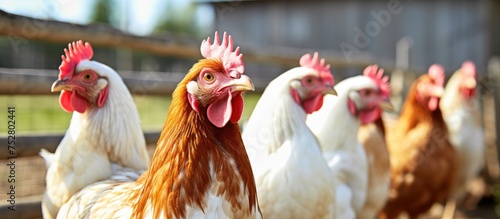 © Ilgun, Fototapeta premium A Diverse Flock of Free-range Chickens Roaming and Pecking in Lush Green Pasture