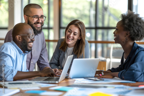 Fototapeta premium A diverse group of businesspeople were working together in an office, smiling and discussing over a laptop computer on a table