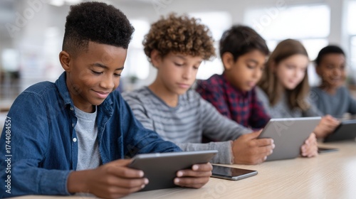 Fototapeta premium A diverse group of children focused on their tablets in a bright classroom. The mood is collaborative and educational, showcasing technology in learning.