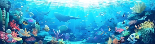 © share, Obraz premium a diverse group of fish, including white, blue, yellow, and orange varieties, swim in a vibrant blue underwater world