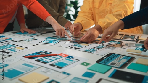 Obraz premium A diverse group of individuals collaborates on user interface mockups at a table filled with notes and tools, emphasizing teamwork in design and innovation. SACTR