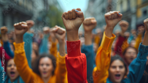Fototapeta premium A diverse group of individuals stands united with their fists raised,...