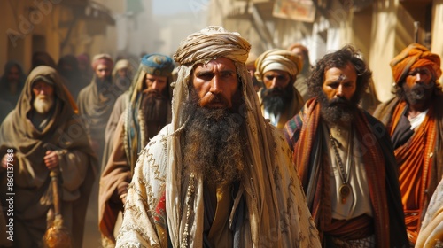 © svastix, Naklejka premium A diverse group of men dressed in traditional, historical robes and turbans walking purposefully through a lively street, illustrating cultural heritage and unity.
