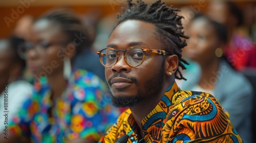 Fototapeta premium A diverse group of people, eager and engaged, attend a vibrant startup...