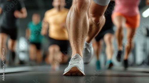 Fototapeta premium A diverse group of people energetically exercising on treadmills in a gym,...