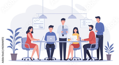 Obraz premium A diverse group of professionals collaborating in a modern office meeting, discussing ideas around a conference table with laptops and documents.