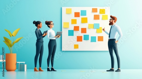 © Exnoi, Fototapeta premium A diverse sales team around a whiteboard, passionately brainstorming new strategies to meet their sales goals, with lots of post-it notes., design illustration