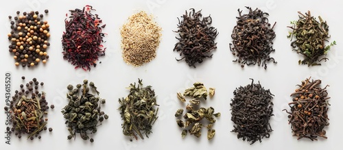 Fototapeta premium A diverse selection of loose leaf teas photographed from above emphasizing an...