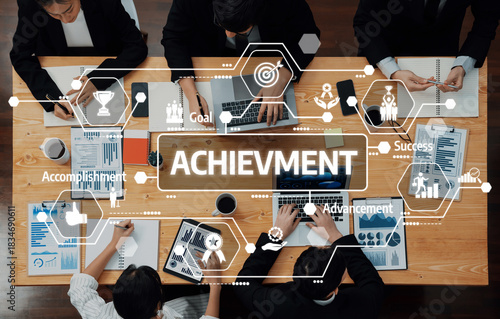 © InfiniteFlow, Obraz premium A diverse team engages in a productive meeting centered on achievement and strategic goals, surrounded by charts and data for business growth and success. Amity