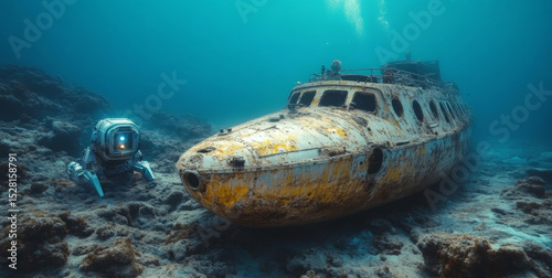 © Prostock-studio, Fototapeta premium A diving exploration robot examines a sunken submarine resting on the ocean floor.
