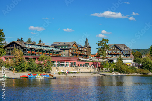 © vip-photoworld, Naklejka premium A dock with a boat and a blue buoy sits on a lake Titisee in Germany