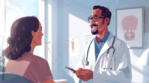Fototapeta premium A doctor discussing treatment options with a smiling patient in a clinical...