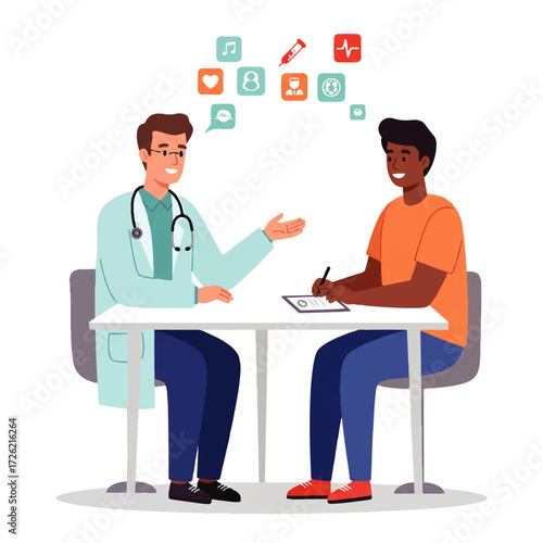 Fototapeta premium A doctor in a lab coat consults with a male patient at a table, surrounded by medical and social media icons.
