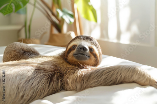 Naklejka premium A dog breed with fawn fur is laying on its back for comfort. Generative AI