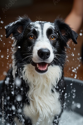 © cff999, Fototapeta premium a dog is being washed in a tub of water