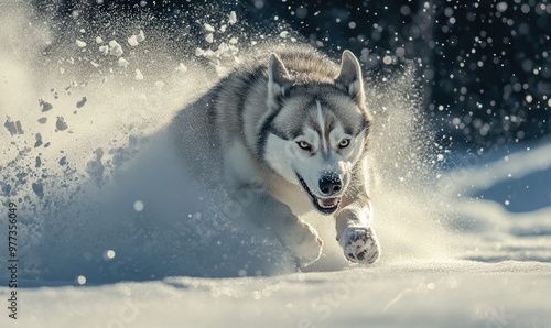 © TheoTheWizard, Naklejka premium A dog is running through the snow with its mouth open