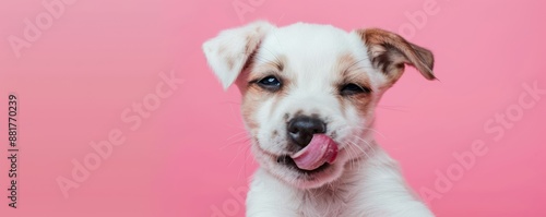Fototapeta premium A dog is smiling and has its tongue out. Free copy space for banner.