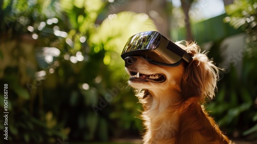 © G-Media, Obraz premium A dog wearing a virtual reality headset is looking at the camera. The dog appears to be enjoying the experience, as it is smiling and has its mouth open