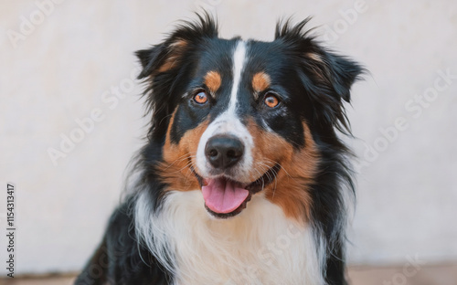 Fototapeta premium A dog with a tri-color coat, predominantly black, white, and brown. The dog has bright, expressive eyes and is panting slightly with its tongue out.