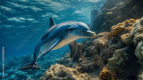 Fototapeta premium A dolphin glides effortlessly through clear water, exploring vibrant coral...