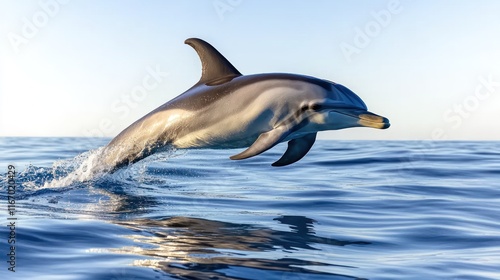 Fototapeta premium A dolphin gracefully leaps above the ocean surface at sunset.