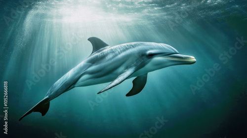 Obraz premium A dolphin gracefully swims underwater in a sunlit ocean environment,...
