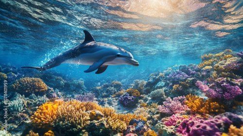 © liliyabatyrova, Fototapeta premium A dolphin is swimming in the ocean near a coral reef