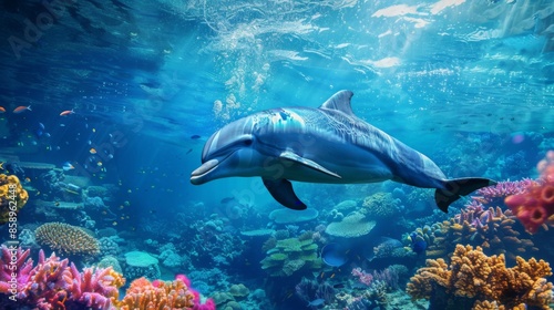 Fototapeta premium A dolphin is swimming in the ocean with a lot of colorful fish around it