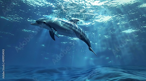 © Thanthara, Obraz premium A dolphin is swimming underwater in a deep ocean
