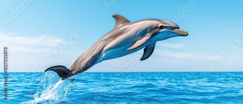 Obraz premium A dolphin jumping gracefully out of the ocean under a clear blue sky.