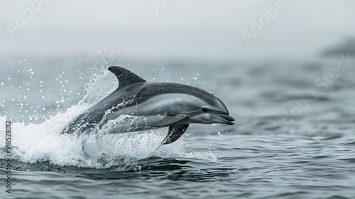 © Olga, Fototapeta premium A dolphin leaping from the water, mouth agape, head emerging