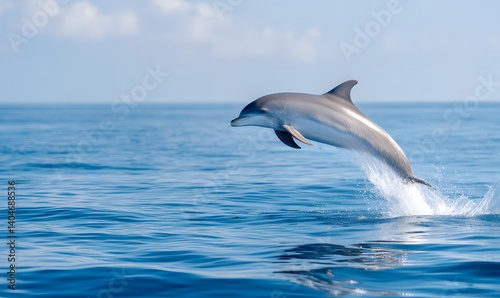 Fototapeta premium A dolphin leaping out of the blue ocean water, Generative AI