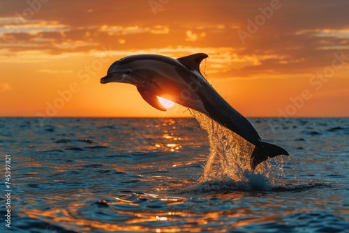 Obraz premium a dolphin leaping out of the ocean at sunset.